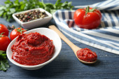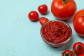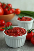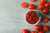 Miski z pastą pomidorową na szarym tle ze składnikami