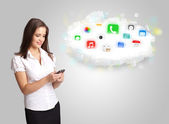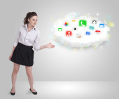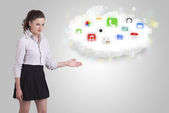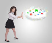Młoda kobieta prezentuje chmurę z kolorowymi ikonami aplikacji i symbolami