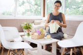 Przyjemna kobieta siedzi na wygodnej kanapie przy stole ze zdrowym smacznym jedzeniem i pić hygge boho scandi