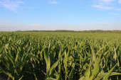 Roślina kukurydzy we wczesnym stadium wzrostu widoczne z bliska z czystym niebem w tle