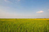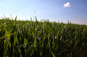 Roślina kukurydzy we wczesnym stadium wzrostu widoczne z bliska z czystym niebem w tle