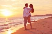 Piękna biała para całuje się na wybrzeżu morza o wschodzie słońca