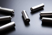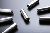 Baterie rozmieszczone obok siebie, na ciemnej powierzchni. Baterie, energia i szacunek dla środowiska. Baterie alkaliczne lub akumulatorowe.