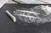 Stos białych narkotyków z żyletką i amerykańską walutą zwiniętą do wciągania..
