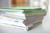 piramida wielokolorowych książek lub albumów fotograficznych. Miejsce napisania.