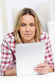 młoda kobieta oglądania ekranu komputera myślenia i trzyma okulary