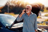 Starszy mężczyzna stojący przy uszkodzonym samochodzie po wypadku drogowym dzwoniący do firmy odzyskującej awarię za pomocą telefonu komórkowego