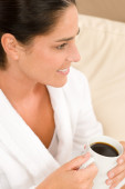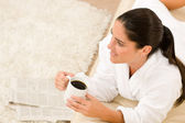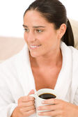 młoda kobieta korzystających z filiżanką kawy w kuchni