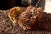 Zbliżenie na bur zawierający kasztany jesienią w Cevennes (Saint-Laurent-le-Minier, Francja)