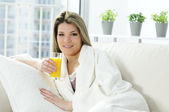 młoda kobieta korzystających z soku pomarańczowego i śniadanie w nowoczesnej kuchni