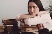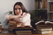 zadowolona młoda kobieta w kolczykach opierając się na stosie książek odizolowanych na białym