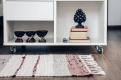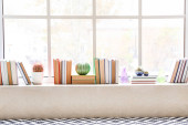 dzikie kwiaty w pobliżu stosu książek z twardą oprawą i dzianiny worek krzyżowy na białym, sztandar