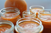 sos pomidorowy w małym słoiku ze świeżym pomidorem na stole