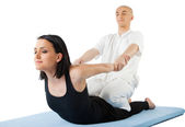 fitness - zdrowa para rozciągania po treningu na biały