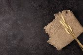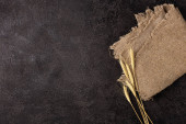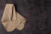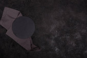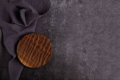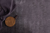 Stara, ciemna deska do krojenia na ciemnym tle. Deska do krojenia jedzenia. Deska jest zwęglona. Podpis. Serwetka lniana szara