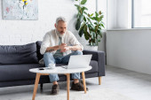brodaty mężczyzna za pomocą laptopa podczas siedzenia na kanapie w pobliżu filiżanki kawy i smartfona z pustym ekranem na zamazanym pierwszym planie