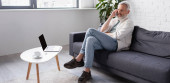 brodaty mężczyzna z siwymi włosami siedzący na kanapie i korzystający z laptopa w salonie