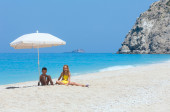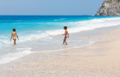 zachód słońca, lśniącej powierzchni morza i dziewczyny na plaży