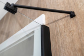 Nowoczesny, czarny metalowy, ukryty prysznic z dużym deszczownicą, umieszczony na płytkach.