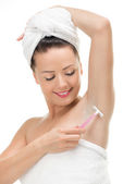 uśmiechający się golenie pod pachami za pomocą brzytwy biały