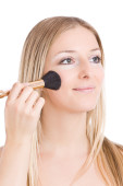 piękne czerwone włosy kobieta stosowania proszku na białym tle