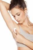 młoda kobieta do golenia pod pachami na białym tle