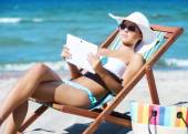 plaży - szczęśliwa młoda kobieta zrelaksować się z książką na leżaku w bikini z Słomkowy kapelusz
