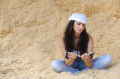 plaża - rozgwiazda na piasku, kobieta w bikini z książka w tle