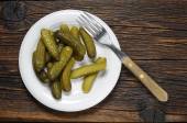 Gherkins, marynowany ogórek na widelcu, miska marynowanych warzyw na rustykalnym drewnianym tle. Czyste jedzenie, wegetariańska koncepcja żywności