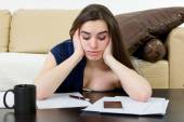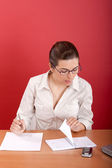 kobieta młody brązowe włosy pisanie notatek i leżącego na podłodze drewnianej