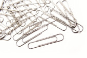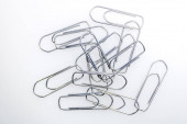 Błyszczące metalowe spinacze na biurku z papeterią w biurze. Widok bliski.