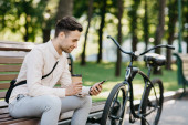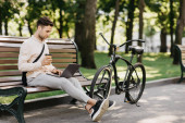 Zdjęcie "Ulubiona muzyka podczas przerwy w pracy, nowoczesna aplikacja mobilna i praca na świeżym powietrzu" może być wykorzystywane do celów osobistych i komercyjnych zgodnie z warunkami zakupionej licencji Royalty-free. Obraz jest dostępny do pobrania w jakości wysokiej rozdzielczości do 5760x3840.