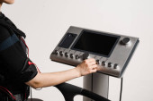 Druty z kombinezonu ratowniczego na siłowni. Trening sportowy w elektrycznym kombinezonie do stymulacji mięśni. Wykonywanie ćwiczeń fizycznych.