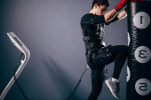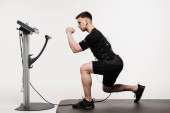 Dziewczyna w kombinezonie na siłowni. Trening sportowy w elektrycznym kombinezonie do stymulacji mięśni. Wykonywanie ćwiczeń fizycznych.
