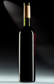 Martwa natura z butelkę i kieliszek czerwonego wina na ciemnym tle.