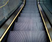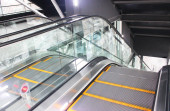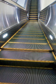 Nowoczesne luksusowe schody ruchome. wideo ruchome kroki koparki zmienia. z klatką schodową w centrum handlowym Koparka metalowa z oświetleniem neonowym z gumowymi poręczami, widok na schody, zejście do podłogi