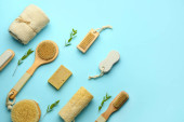 Skład ze szczotkami do masażu i przyborami do kąpieli na tle koloru