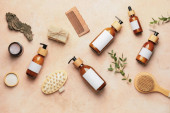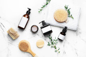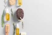 Kompozycja ze szczotkami do masażu i przyborami do kąpieli na jasnym tle