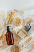 Skład ze szczotkami do masażu i przyborami do kąpieli na tle koloru