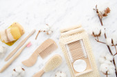 Skład ze szczotkami do masażu i przyborami do kąpieli na tle koloru