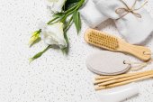 Kompozycja ze szczotkami do masażu i przyborami do kąpieli na jasnym tle