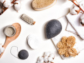 Skład ze szczotkami do masażu, przyborami do kąpieli i kwiatami bawełny na białym tle