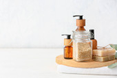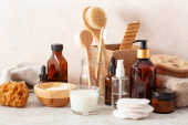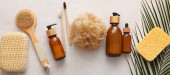 Kompozycja ze szczotkami do masażu i przyborami do kąpieli na jasnym tle, zbliżenie