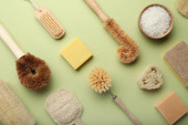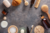 Kompozycja ze szczotkami do masażu i zaopatrzeniem kąpielowym na szarym drewnianym tle