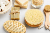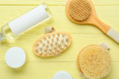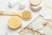 Kompozycja ze szczotkami do masażu i produktami kosmetycznymi na drewnianym tle, zbliżenie