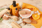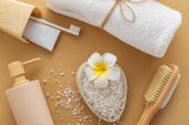 Skład ze szczotkami do masażu, przyborami do kąpieli i kwiatami na tle koloru