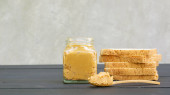Słoik i chleb ze smacznym masłem orzechowym na grunge tle