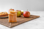 Słoik ze smacznym masłem orzechowym i kawałkami chleba na jasnym tle
