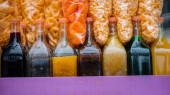 Miski z plasterkami wapna i gorącymi sosami na czerwonym i pomarańczowym obrusie