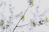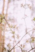 pierwsze liście na drzewach, pąki drzew z bliska. Makrofotografia wiosny. piękny abstrakcyjny bokeh i niewyraźne w tle, rozmyte kolorowe zdjęcia filmowe z hałasem